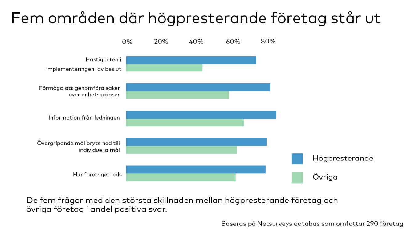 Vad skiljer de företagen som vi definierar som High Performing* jämfört med resten av företagen i vår databas? Jo, de har en bra ledning som är bra på att kommunicera, tydliga målsättningar som följs upp och en stark kultur där medarbetarna är stolta över det företaget levererar och kan driva igenom egna idéer.